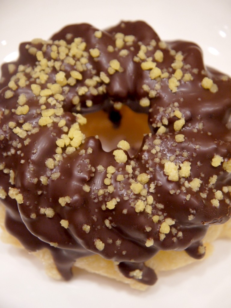 フレンチクルーラーの生地を、チョコレートでコーティングし、ゴールドのクラムを塗したもの。