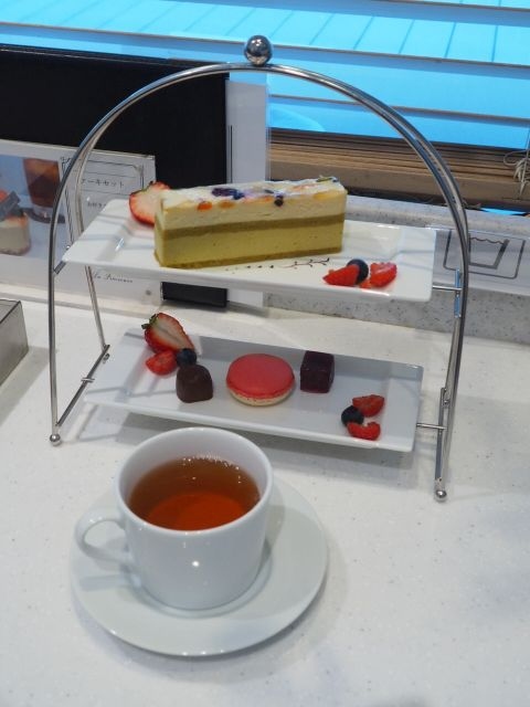 2段式のティースタンドで、ケーキ、マカロン、ボンボンショコラ、パートドフリュイ(フルーツピューレを固めたジューシーなゼリー)が提供される。
