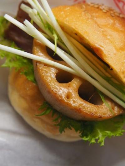 パティの代わりに分厚くスライスされたレンコンを使っているのが特徴。よって、バーガーとなっているものの、肉は一切使われていない。