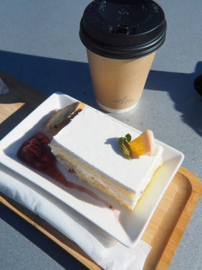 ケーキの味、紅茶には特に問題は無かったが、この日は寒い上に風が吹き付けていて、テーブルのパラソルは閉じられていた。にも拘らず晴天で、直下日光・強風の中でケーキセットを食す羽目に。