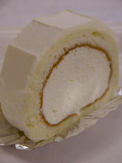 練乳ミルクのクリームを、白に近いふんわりケーキ生地で巻き、更に練乳ミルクのクリームで覆っている。
