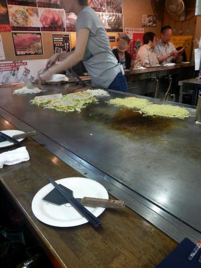 お好み焼自体が盛り上がっていて、それにネギが山盛りトッピングされるので、小山に見える。イカ天の食感と、大葉の香りが、カープソースとマッチする。