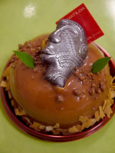 薄いソフトクッキーに、ココアとオレンジの果肉入りのヘーゼルナッツのムースを載せ、ヘーゼルナッツソースで覆い、奇妙な顔のチョコをトッピング。