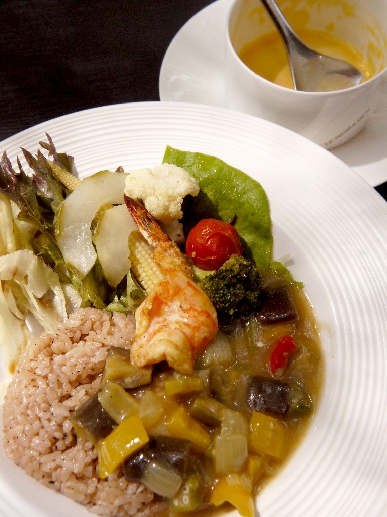 茶(加賀棒茶とアールグレイを使っているらしい)で炊き出したご飯に、野菜タップリのエスニックカレーをかけ、海老と野菜を添えている。