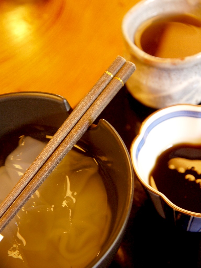 蕎麦・蕎麦つゆのごとく黒蜜に付けながらいただく。