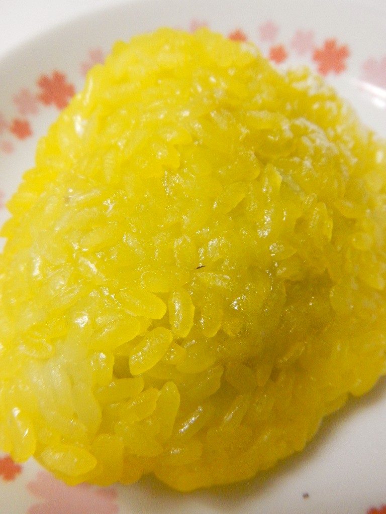 黄色に着色し、粗く蒸し餅米(黄色でなくても良いらしい)の中に、漉し餡が。