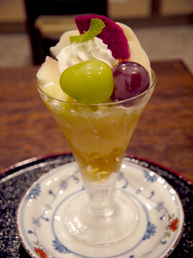 白桃ピューレ、ジャスミンティのジュレ、アイスクリーム、そして本日の果物(白桃、メロン、ピオーネ、シャインマスカット、パイナップル、ドラゴンフルーツ)から成り立っている。