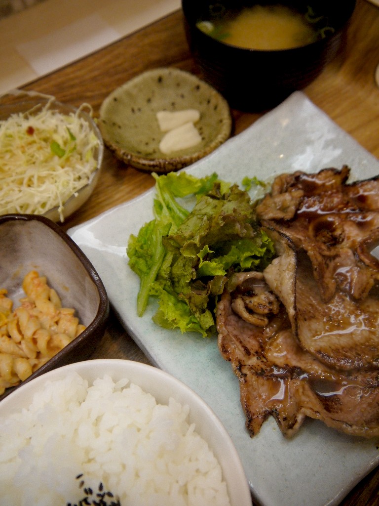 「豚の生姜焼き」となっているものの、生姜の風味はあまり感じられず、豚の鉄板焼、といった感じ。豚肉の風味を思う存分味わえ、「肉を食べている」という気分にさせてくれる。