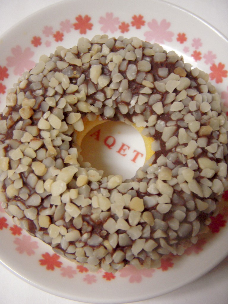 ココア風味のドーナツに、クラッシュアーモンドをこれでもか、と塗している。