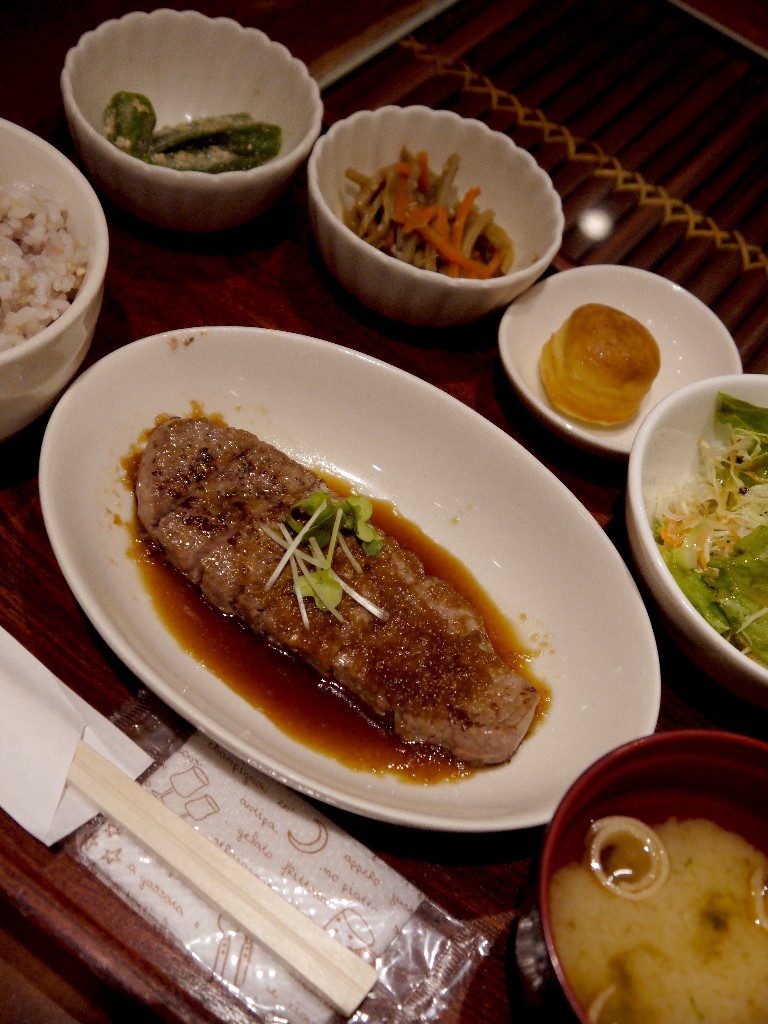 ステーキは100g程度。ミディアムレアに焼かれており、醤油ベースのタレで仕上げられていた。マスタードを付けながらいただく。肉は柔らかく、日本らしいステーキだった。一方で、アメリカの様に自分でフォーク・ナイフで切り分ける様になっていて(カットした状態で提供すると、その分手間がかかるからか)、個人的にはステーキの醍醐味を味わえた。