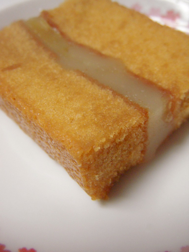 カステラ生地の間に、林檎スライスを挟んでいる。