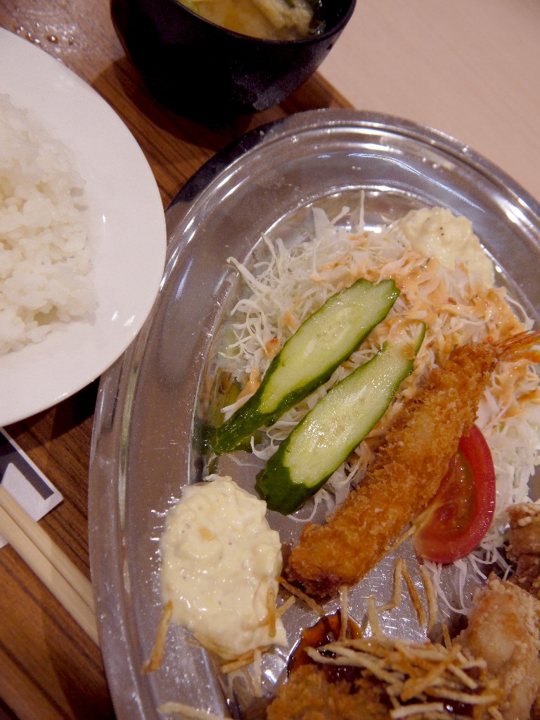 金属製の皿に、鶏唐揚、エビフライ、コロッケもしくはメンチカツ(今回は後者を選択)、そしてサラダが盛られている。