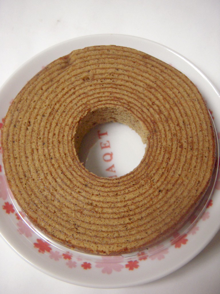リング状にカットされ、年輪の様な模様を確認出来る(バウムクーヘンの本場ドイツでは、この様にカットしないらしい)