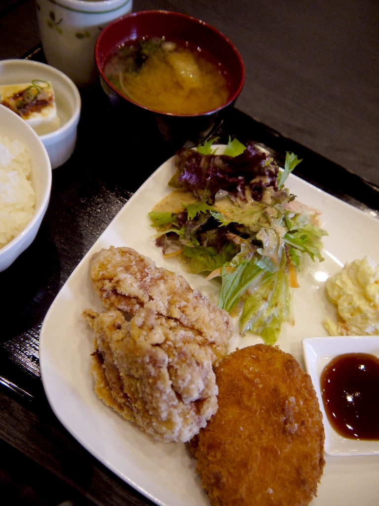 唐揚、揚げ物もう一品(この時はメンチカツがコロッケで、メンチカツを選択)、ご飯、味噌汁、サラダ(グリーンサラダとポテトサラダ)、小鉢(この時は冷奴)から成る。