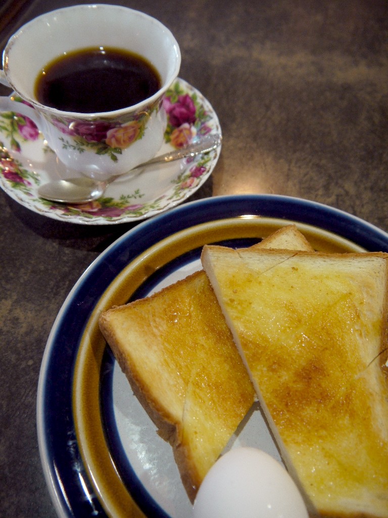 バターを塗ったトーストと、ゆで卵から成る。モーニングが日本で初めて提供された時と全く同じ内容。- 旅行時期