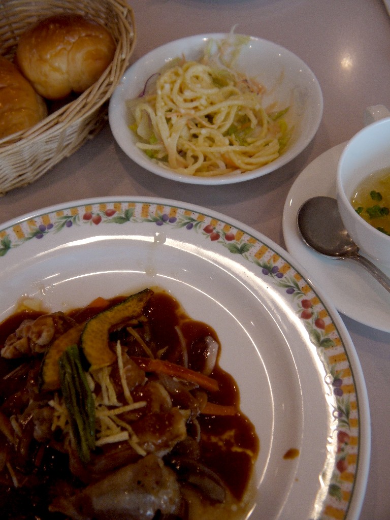 この日のメインは、木の子たっぷりのチキンソテー・デミグラスソースだった。香ばしく焼かれたチキンソテーに、茸やその他様々な野菜を使ったソースをトッピング。何となく中華っぽい料理に仕上がっている。