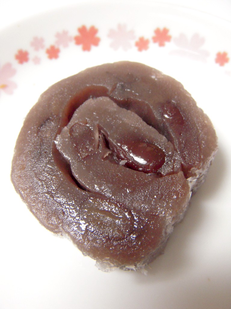 蓬で風味付けられた平たい餅の中に、滑らかな漉し餡が。