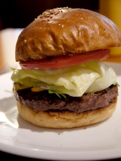 大き目の、軽くトーストされたふかふかのバンズの間に、ビーフパティ、レタス、トマト、オニオンを挟んでいる。