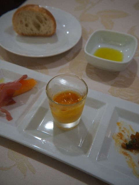 前菜にはニンジンムース、メロンと生ハム、カポナータが提供された。いずれも少量ながらも丁寧に調理されていて、量が多ければメインにも成り得るなと思った。