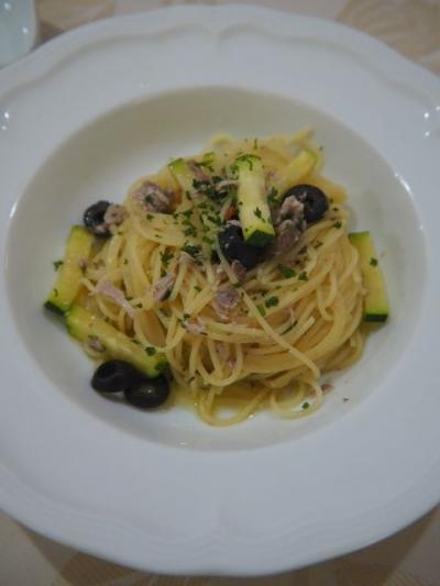 メインのカツオとズッキーニのオイルソースは、カツオとズッキーニをパスタと共にオイルソースで絡めたもの。淡泊なカツオと、シャキシャキのズッキーニが、オイルソースとよく合った。