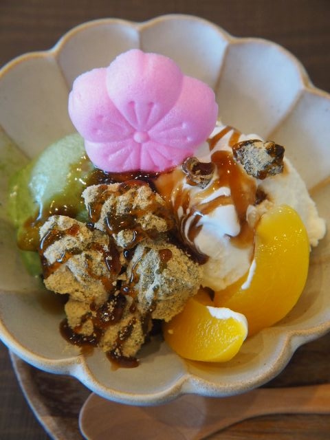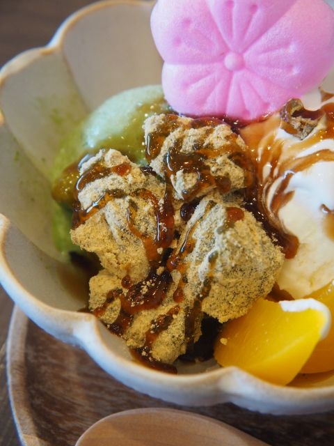 器に三和牛乳ジェラート、ヨモギジェラート、黄桃、黒蜜と和三盆の観点、出陣餅、桜最中(皮のみ)、玄米おこしを盛り、黒蜜を掛けている。