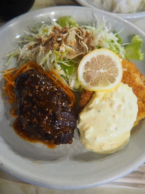 ご飯、小鉢(ひじきの和え物)、サラダが提供される。