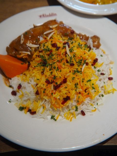 バスマティライスっぽい細長いライスに、サフランで風味付けられたライスを更に盛り、バーベリーを塗してある。非常にカラフルな料理。バーベリーは酸味が強く、その一方で甘みもある。全体的にこれまで味わった事の無い米料理だった。- 旅行時期