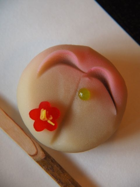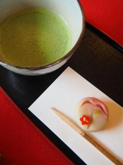 椿の花をあしらった、春の入り口辺りの時期に相応しいお菓子。ほろ苦い抹茶ともよく合った。- 旅行時期