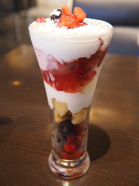 容器に苺、ブルーベリー、苺アイス、バニラアイス、スポンジケーキを盛り、容器を生クリームで蓋をし、最上部を軽く炙ってカリカリにしている。