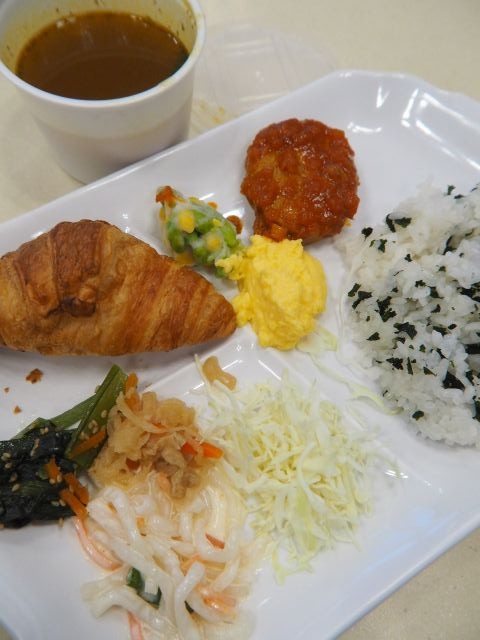 日替わりカレー、おかず3種、ライス、スープから成る。