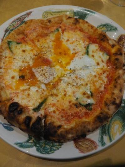 モッツァレラチーズ、バジリコ、半熟卵のピッツァ。