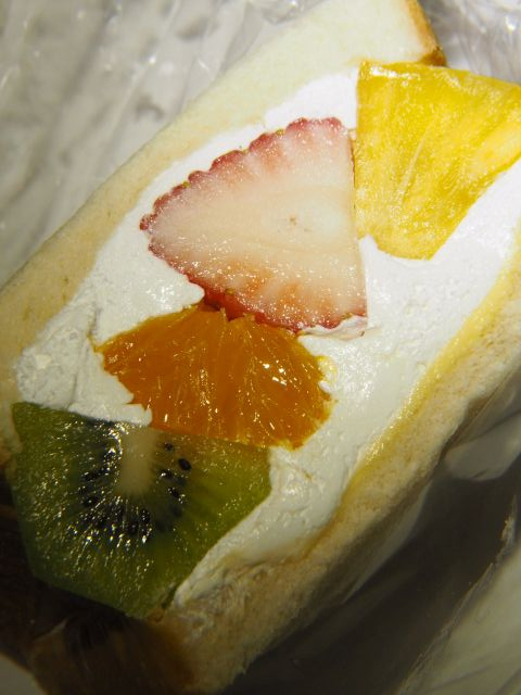 キウイフルーツ、オレンジ、イチゴ、パイナップルを生クリームと共に食パンで挟んでいる。