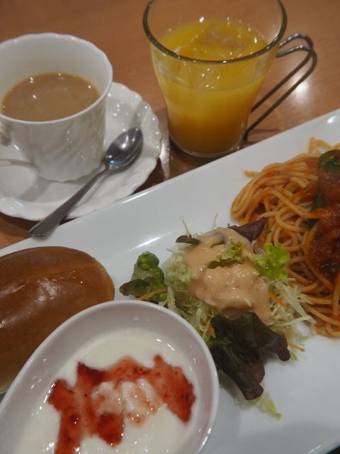 パン、サラダ、ヨーグルト、オレンジジュース、コーヒーといった一般的なモーニングに、スパゲティを追加したもの。