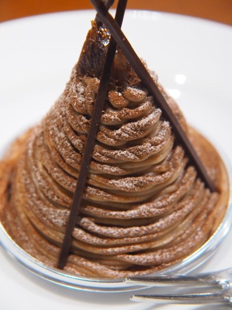 チョコのスポンジにラム酒を利かせ、フランスとイタリア産の栗を使っている。奇麗な円錐に仕上げられていて、まさにモンブランの山っぽい。