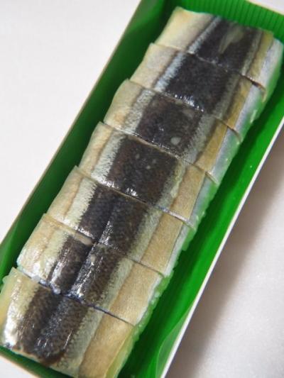背開きにしたサンマを酢で締めて寿司飯に乗せたもの。