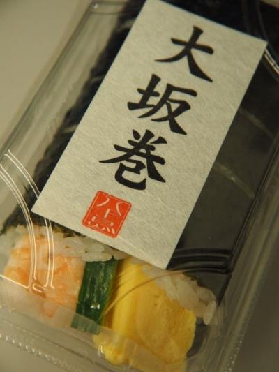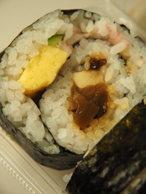 だし巻玉子、干瓢、椎茸、高野豆腐、海老、穴子、胡瓜、おぼろを巻いている。