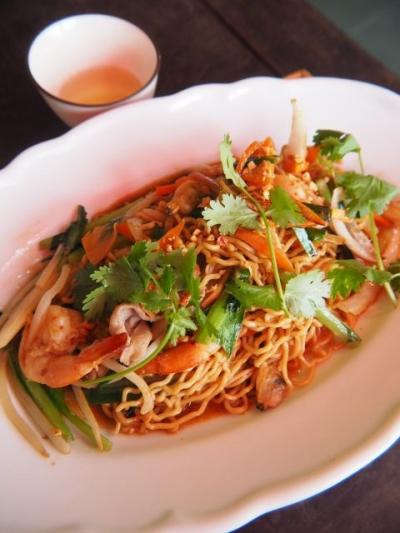 エスニック風味のソースで、海老やイカやアサリ等の海産と共に麺を炒めている。