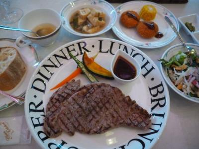ビーフステーキはピラフとパスタの上に乗っかっていて、サラダが添えられている。