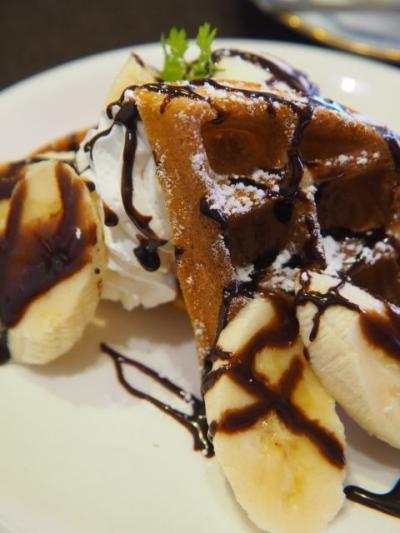 ハーフサイズのふかふかワッフルが生クリームとバナナとバニラアイスと共に盛られ、チョコレートソースをたっぷり掛けてあった。