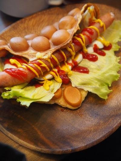 巨大なふかふかワッフル(香港発祥のバブルワッフルというらしい)を二つ折りにし、ソーセージ1本、レタス、茹で玉子の輪切りを挟んでいる。