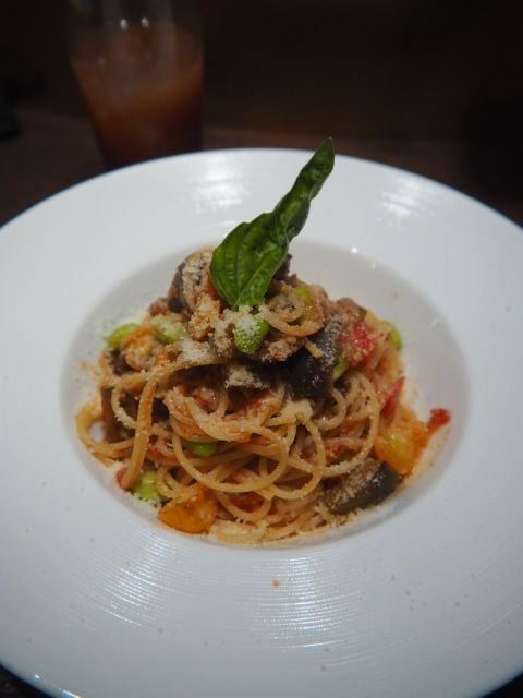 パスタを、トマトソースと、様々な夏野菜(ナス、そら豆、赤ピーマン、黄ピーマン等)と絡めている。
