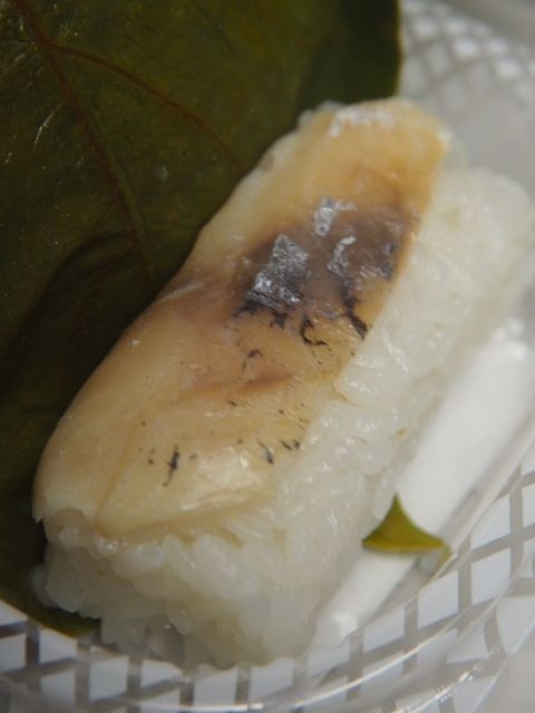 酢飯に、薄くスライスした魚介を重ね、重石を乗せて発酵・熟成させ、一口サイズにして柿の葉で包んでいる。