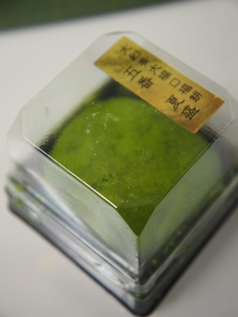抹茶風味の餅で、抹茶クリーム入りの餡を包み、抹茶を外側に塗している。