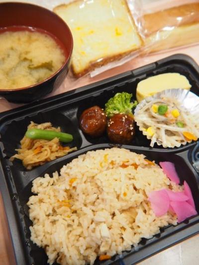 トースト、サラダ、ウィンナー、カットフルーツ、茹で卵、ヨーグルト、ドリンクから成る。