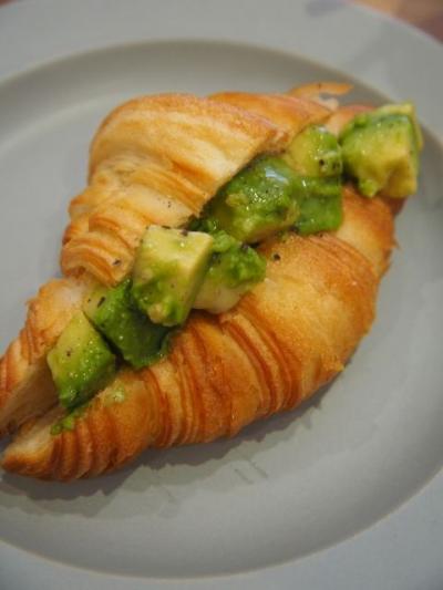 クロワッサンに切れ込みを入れ、アボカドを入れ、レモンドレッシングを掛けている。