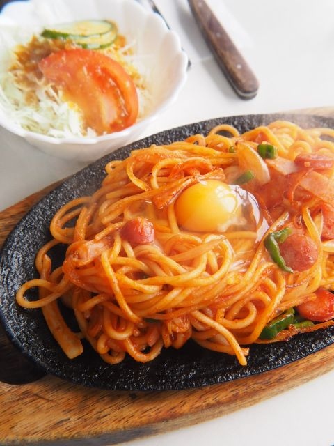 鉄板ナポリタンは、熱々の鉄板上にナポリタンが盛られていて、中央に生卵が落としてある。生卵をパスタと絡ませると、余熱で卵に火が通っていき、全体の味も変化していく。。