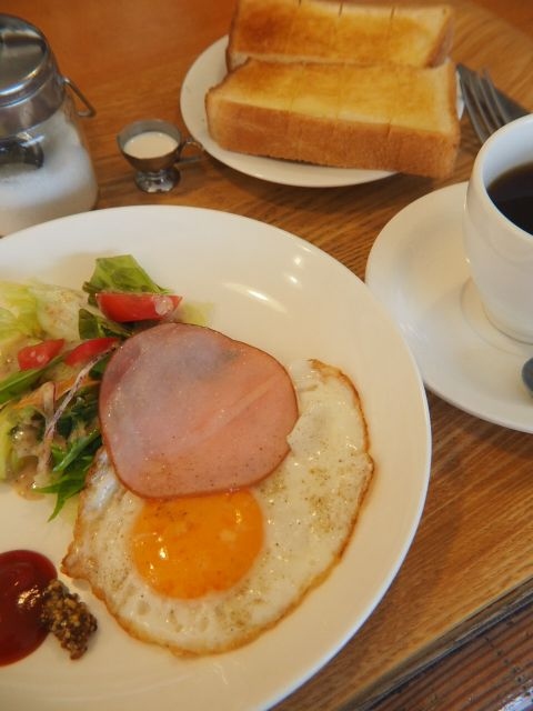 メインのプレートに目玉焼き、ハム、サラダが盛られ、別の皿でバタートーストが提供される。