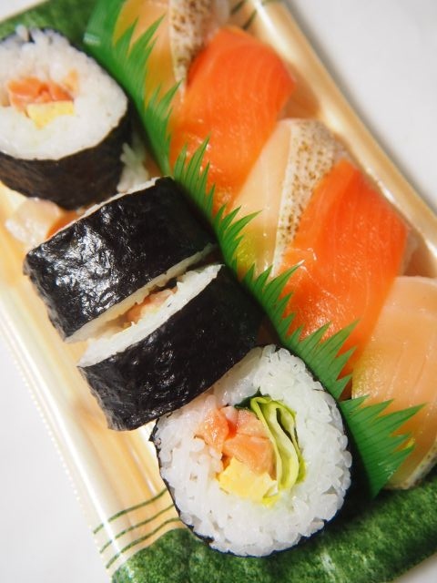 サーモンと玉子の太巻き、赤身のにぎり、トロのにぎりのセット。