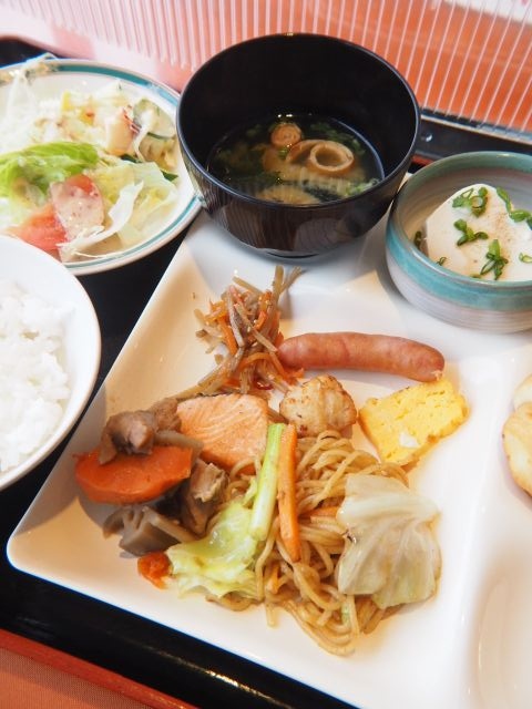 カレー焼きそば、焼き魚、ウィンナー、卵焼き、筑前煮、冷ややっこ、きんぴらごぼう、サラダ、味噌汁、パンが提供されていた。