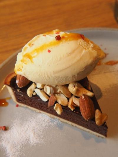 タルトの型に、チョコレートとフランボワーズを混ぜ合わせた生地を流し込み、ナッツを重ね、バニラアイスをトッピング。